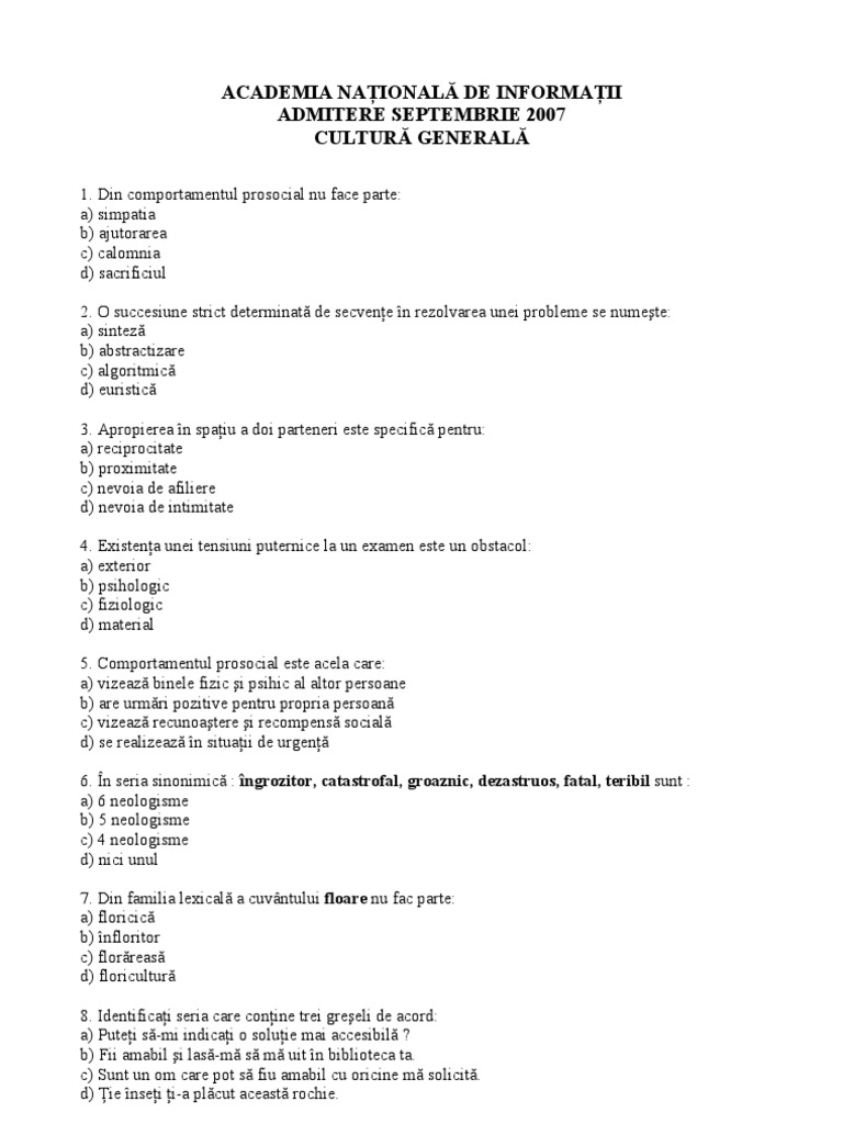 Test Cultura Generala Academia Nationala De Informatii