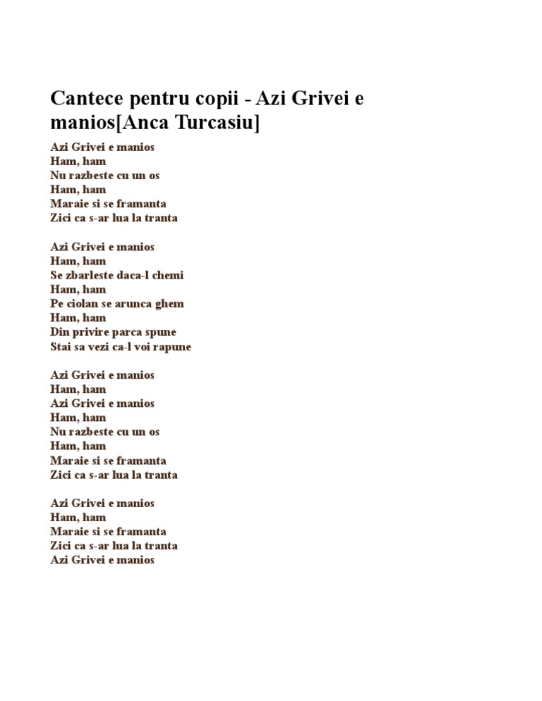 Versuri Azi Grivei E Manios Cantece Pentru Copii Versuri Lyrics