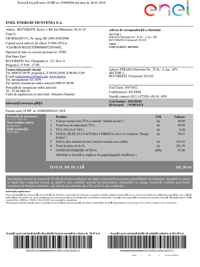 17 67 lei soldurile neachitate pentru facturile precedente au datele scadente inscrise pe fiecare factura in parte. într un minut primești un sms de răspuns cu soldul tău actualizat. 01 08 2017 31 08 2017 temei legal. Ghid noua factură enel aceasta este noua factură enel mai prietenoasă și ușor de înțeles.