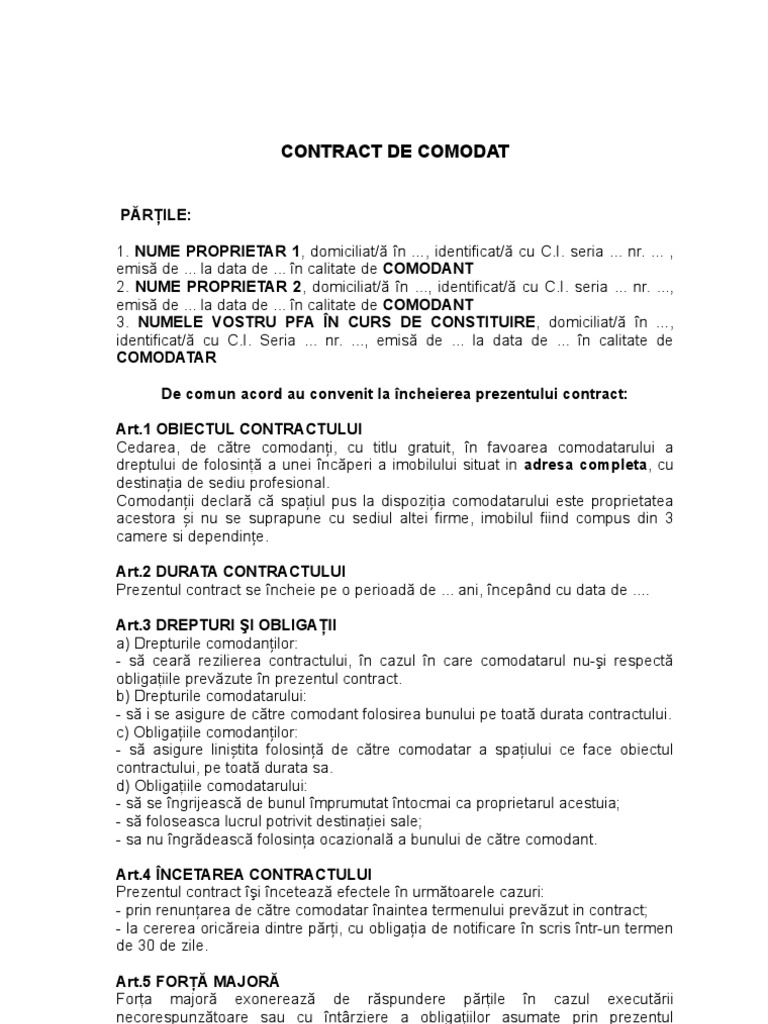 Model Contract De Comodat Sediu Punct De Lucru Pfa