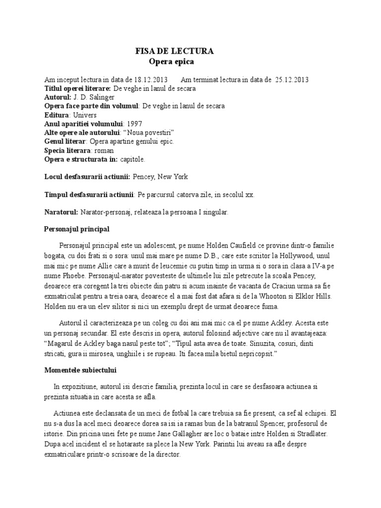 De Veghe In Lanul De Secara De Salinger Rezumatul Operei Literare