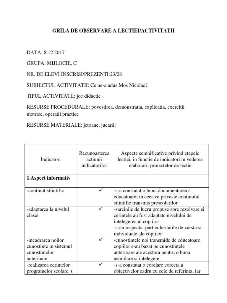 Grila De Observare A Activitatii La Practica Pedagogica Pentru
