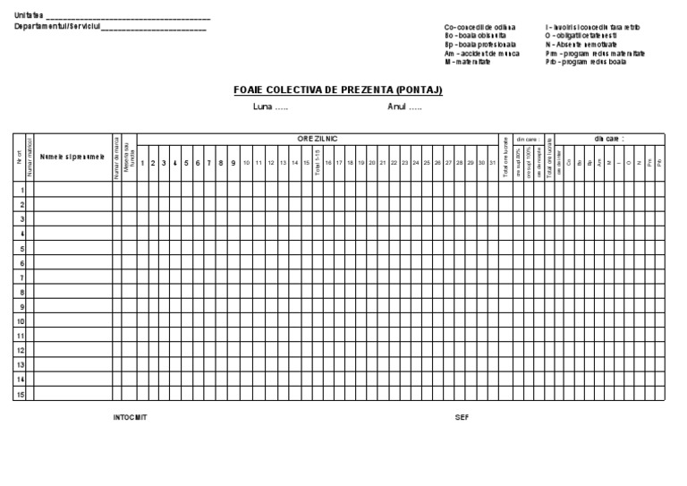 Foaie colectiva de prezenta model download. Foaie de pontaj sau foaie colectiva de prezenta operaţie prin care se înregistreaza prezenţa muncitorilor la locul de munca cantitatea produselor efectuate într un anumit interval de timp sau timpul folosit pentru efectuarea unei lucrari în vederea calcularii salariului sau a platii. Sa imi scoata in evidenta sambetele si duminicile. Academia edu is a platform for academics to share research papers. De regula acest lucru se facea in trecut si in unele cazuri se mai face si astazi prin pontaj intr o asa numita foaie colectiva de prezenta.