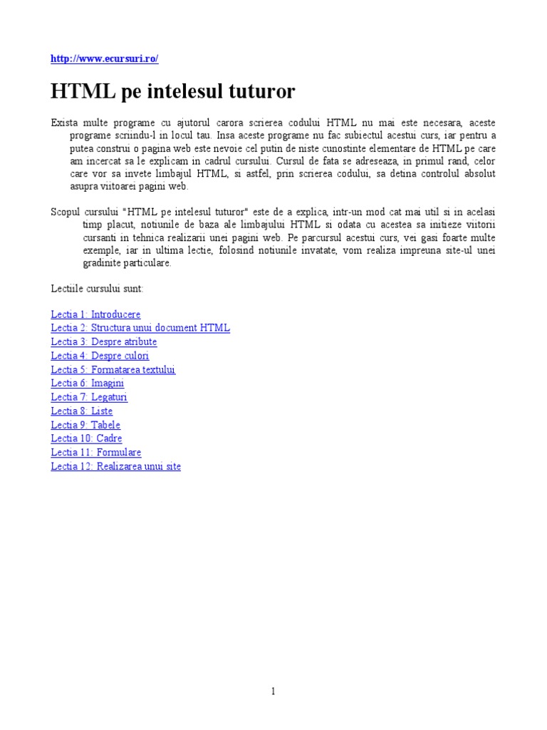 Lectii html online pentru web development learn html limbajul html pe intelesul tuturor scopul cursului html pe intelesul tuturor este de a explica intr un mod cat mai util si in acelasi timp placut notiunile de baza ale limbajului html. Gramatica limbii engleze 27 lectii online. Dar care sunt ideile principale ale acestei. Windows xp prin exemple 10 lectii online.